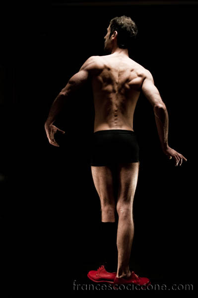 Aver continuamente paura di crollare, essere sul filo del rasoio, mostrarsi deboli per non cadere: Salvatore Santangelo è un eroe, un uomo solo di fronte ad un destino, quello che ha letto negli occhi del padre la sera dell’8.10.88. In scena lo troviamo solo, forte e debole, nostalgico e vendicativo nei confronti di un passato che lo ha trasformato totalmente. Sono le scarpe le sue maschere che, invece di celare, rivelano la malattia, quella falsa zoppia che è l’ultimo e disperato tentativo di rimanere in equilibrio. Sulla scena Santangelo si rivela amante di Elvis e del rock, in totale contrasto con l’armonia della danza, suo esatto opposto, in grado di cancellare ogni accenno della grazia infantile e strumento magico capace di scacciare la morte.