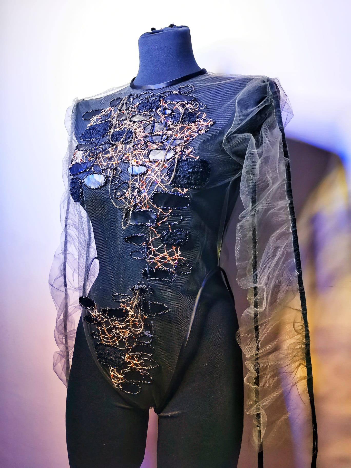 Le lavorazioni tridimensionali, caratterizzate da incrostazioni materiche, ricordano le forme organiche di muschi e licheni, che, sovrapposti alla trasparenza del tulle, creano un effetto vedo-non vedo di pieni e vuoti, per una sensualità dalle infinite combinazioni.