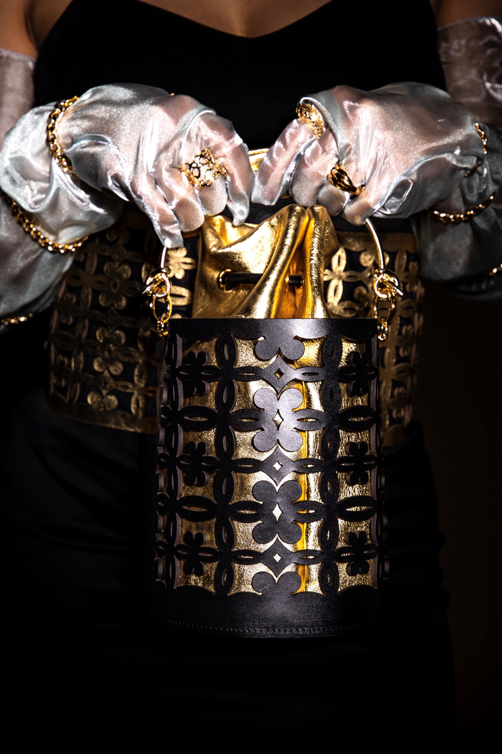 Le decorazioni in foglia d’oro, il gusto per i mosaici bizantini e l’influenza orafa, che arricchiscono le opere del cosiddetto periodo aureo, si ritrovano negli accessori celebrando una preziosa artigianalità.