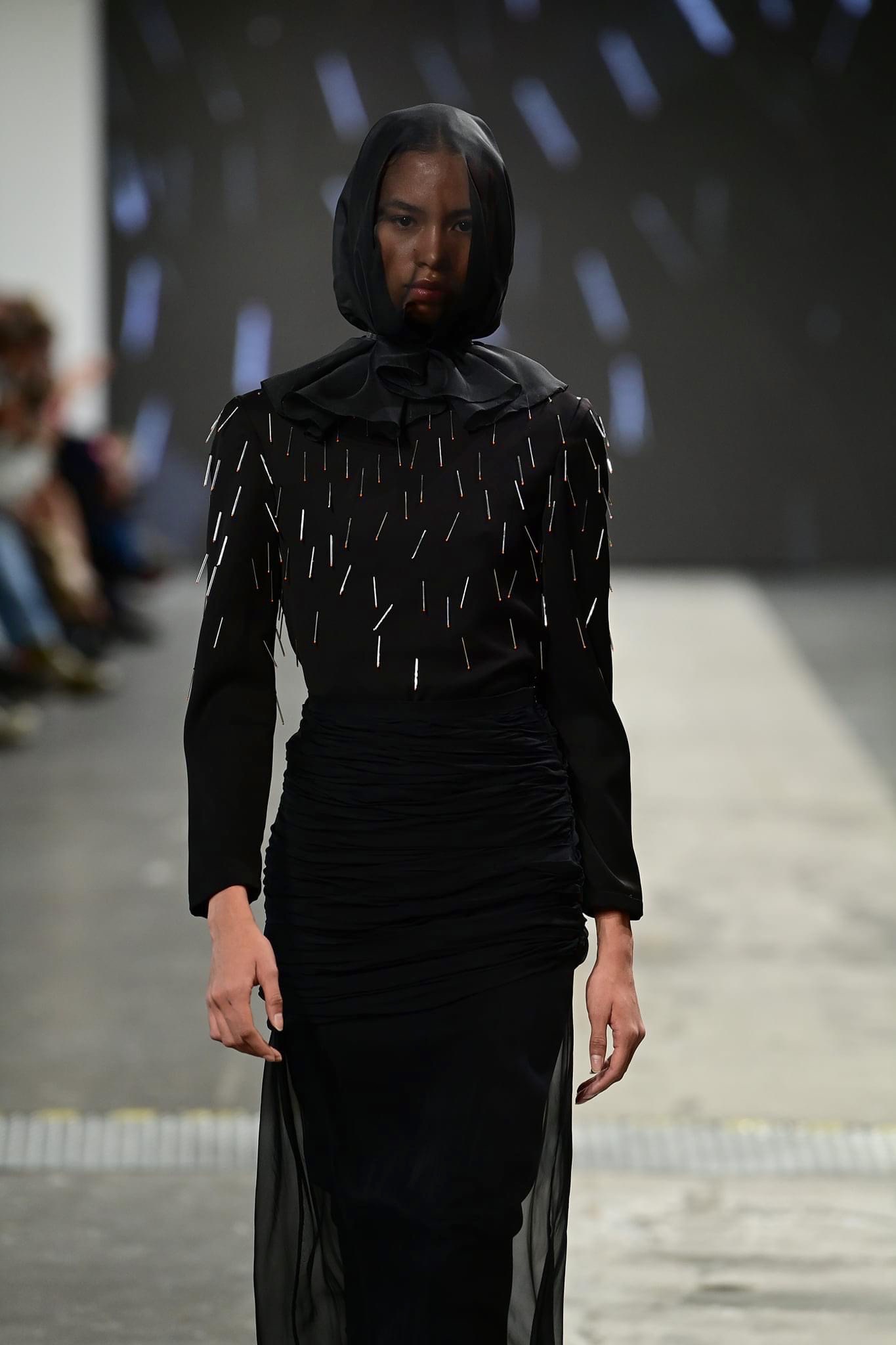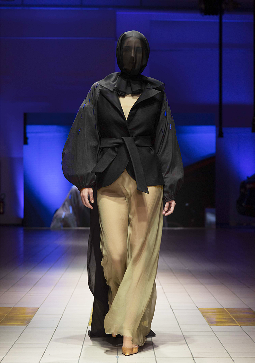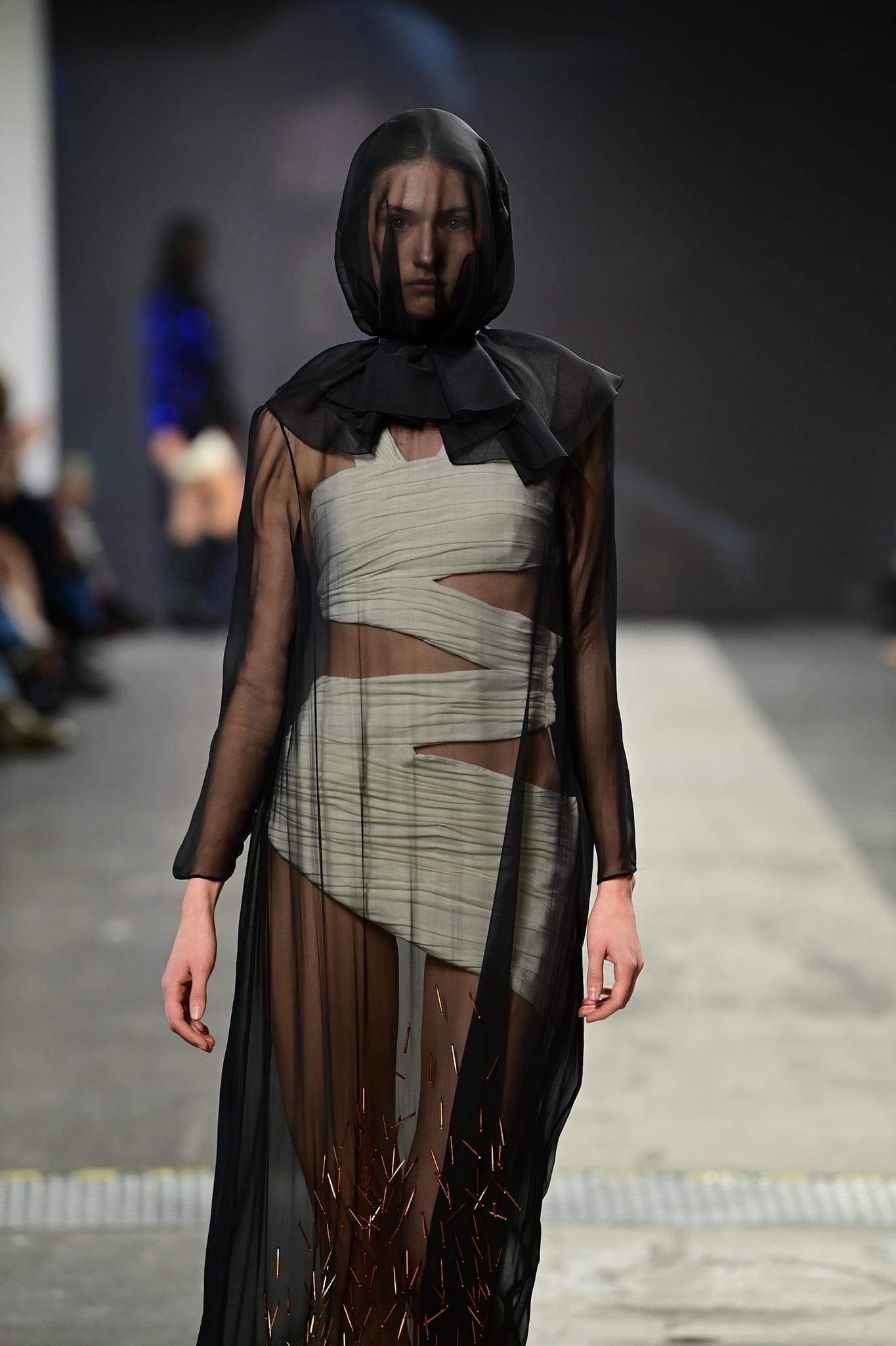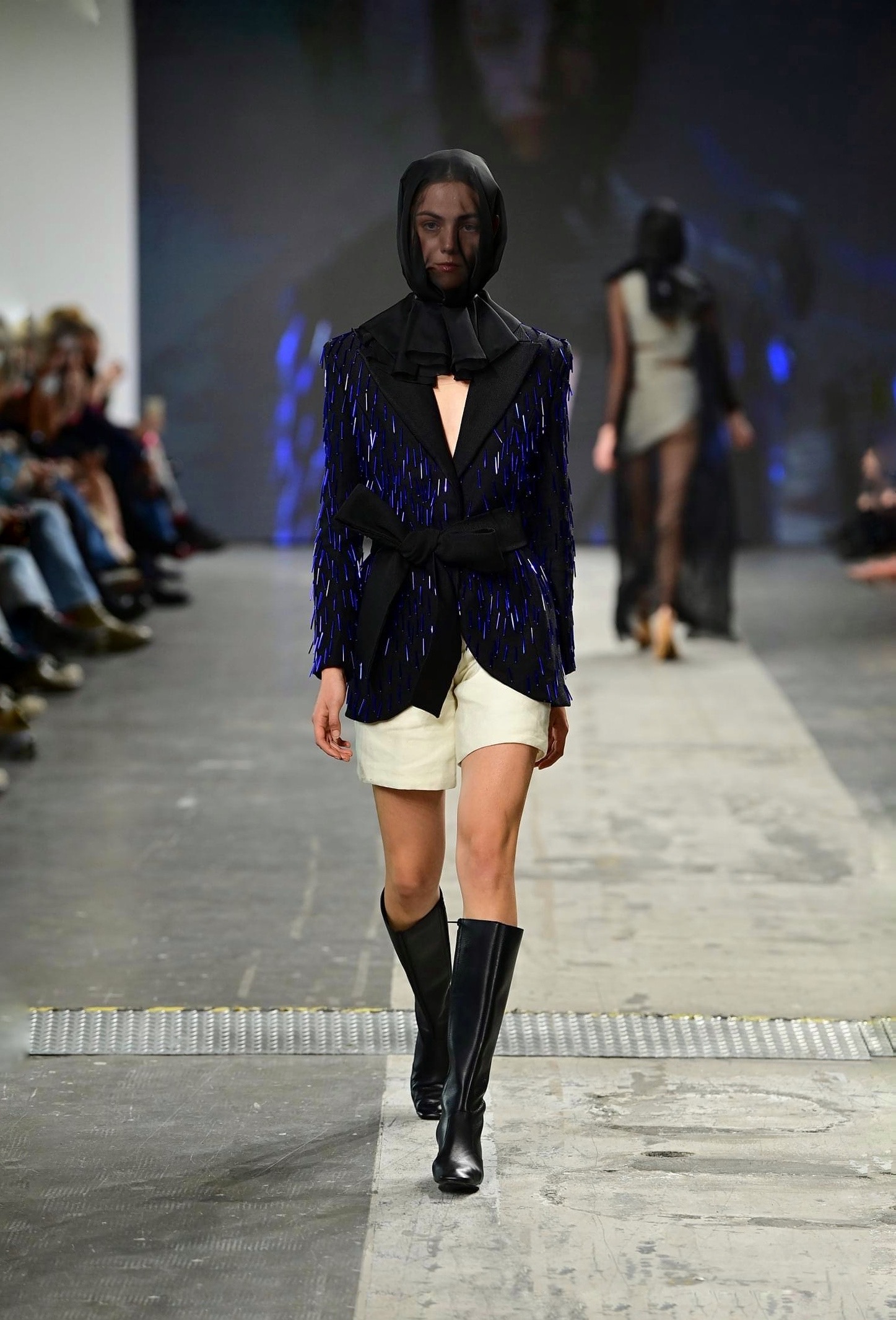 La capsule “Crisalide” si ispira a Casa di bambola, il testo teatrale di Ibsen che racconta la storia di Nora, una donna pronta a scontrarsi violentemente con l’ipocrisia di certe convenzioni sociali. «Depressa e confusa dalla sua fede nell’autorità, perde la sua fede nella sua correttezza morale e nella sua capacità di crescere i suoi figli. Una madre in una società contemporanea che proprio come certi insetti che fuggono e muoiono quando compiono i loro doveri nella propagazione della loro razza.» Questo è ciò che l’autore del testo spiegava nei suoi appunti; riflessioni che tutt’oggi sembrano ancora fortemente contemporanee. Certe libertà vengono ancora negate a secondo dell’identità sessuale e molti doveri ideologici ingabbiano, soprattutto le donne, a degli stereotipi culturali. Perciò la collezione racconta una fase di emancipazione. Un graduale passaggio verso l’esaltazione della vita e la libertà; la capacità di trovare la forza di spezzare le abitudini e mettersi in gioco sul proprio ruolo sociale, alla ricerca del proprio essere. La traduzione materica di questa metamorfosi avviene con tessuti naturali, prodotti utilizzando filati come l’ortica, la canapa, la lana e la seta. Inoltre, la collezione presenta anche maglioni e gonne lavorate a maglia con lana mohair. La gamma cromatica vede la predominazione di colori cupi, su cui vengono applicate lavorazioni con cannucce di vetro blu, topazio e argento.