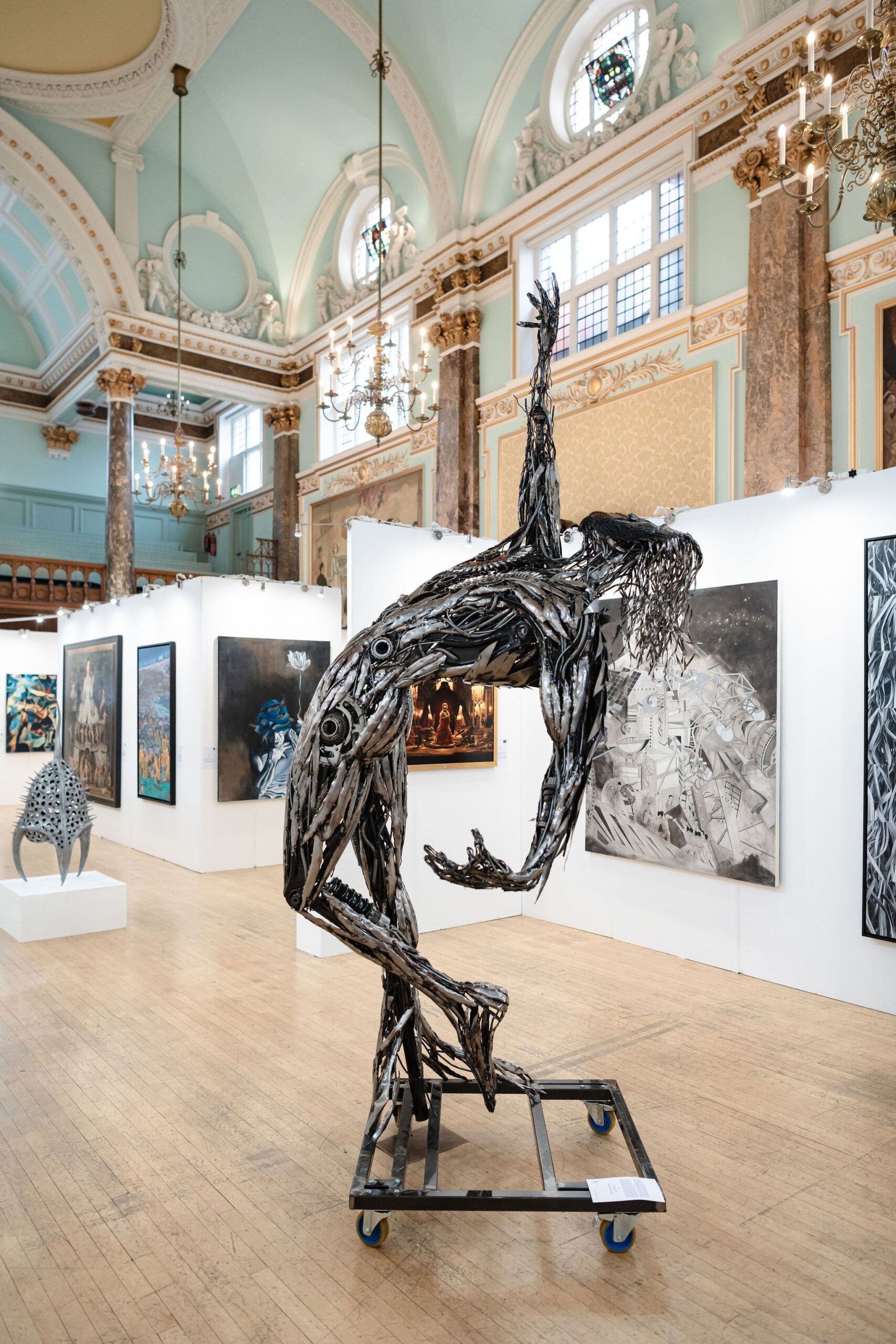 Il ferro, fragile e potente al tempo stesso, diventa linguaggio spirituale: ogni filo saldato è una traccia di connessione, un frammento di luce che attraversa la forma.
