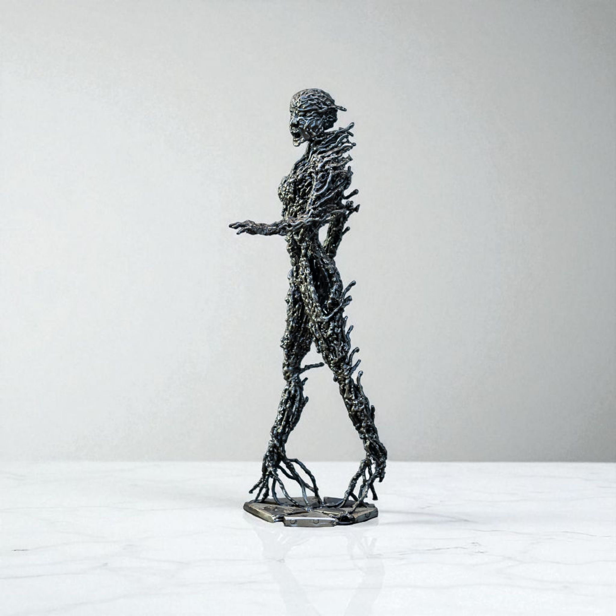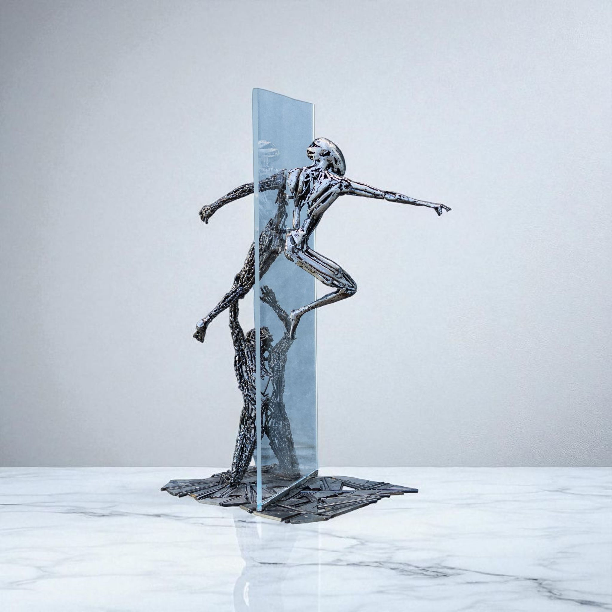 Descrizione: Due figure emergono dal metallo e si inseguono in un arco sospeso, come forze complementari che cercano equilibrio. Nel gesto teso tra contatto e distanza, Unità racconta il bisogno umano di ricongiungersi — con l’altro, con sé stessi, con ciò che trascende la materia.
