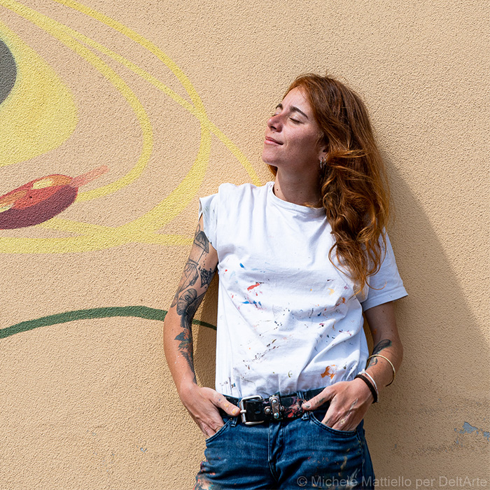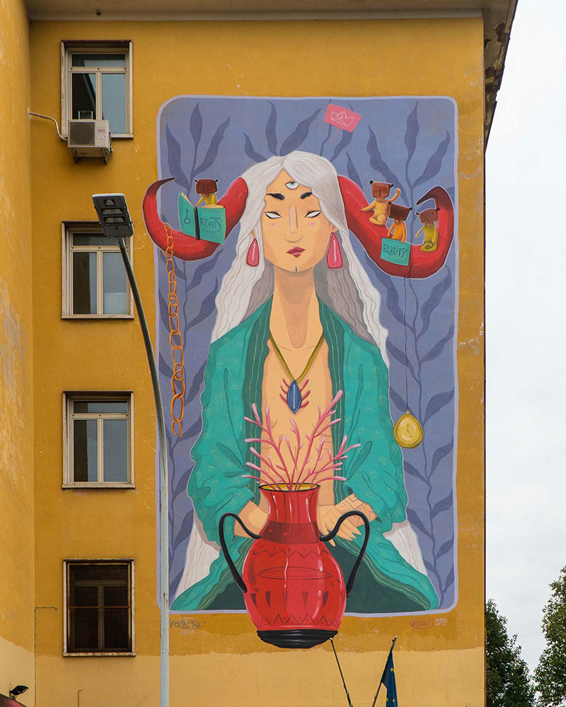 Ginevra Giovannoni in arte Rame 13 è un’artista poliedrica che spazia dall’Urbanart, all’illustrazione, alla grafica ed il tattoo, nata a Pisa il 13-11-89 fin da piccola grazie a suo nonno pittore inizia ad amore il disegno. Dopo aver conseguito la laurea triennale a Pisa in Filosofia e il diploma all’Accademia di arti visive a Firenze, inizia a collaborare con diverse realtà avvicinandosi alla streetart. Figurativa nella consistenza delle forme, astratta nella relazione tra esseri animali e vegetali che abitano le sue opere, Rame13 narra storie che procedono per immagini permeate di divampante fantasia. Le sue opere sono spesso oniriche e sospese in un immaginario unico, caratteristico, ma non per questo meno fruibile; danzano tra temi naturali, circondate di surreali animali e piante colorate, per poi abbracciare figure femminili dalle grandi corna e marinai baffuti che solcano i mari. Il suo stile è maturato nel corso degli anni anche grazie alla vicinanza della sua crew ELEKTRO DOMESTIK FORCE, con la quale porta avanti una mission: L’Arte Sociale. Questa visione comune del gruppo fa sì che Rame13 e i suoi colleghi s’impegnino per raccontare storie, attraverso progetti di riqualificazione urbana, che possano interagire e diventare parte integrante della vita dei cittadini che vivono i posti che le ospitano.